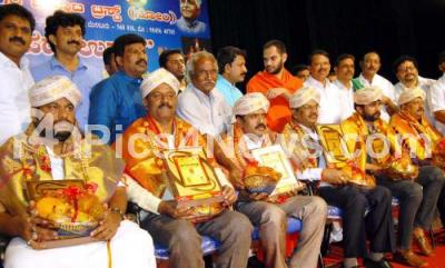 Photo Caption : Achievers in different fields being felicitated by Rajya Okkaliga Okkuta Trust at Kuvempu Kalakshetra, also seen are Nanjava Doota Swamiji and others, in Bangalore on Sunday 28th August 2016
