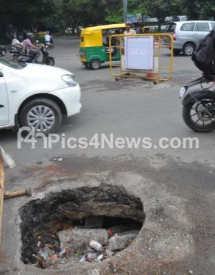 Photo Caption : Crater like holes developed at Kasturba road, causing problems to the motorists, in Bengaluru on Tuesday 30th August 2016