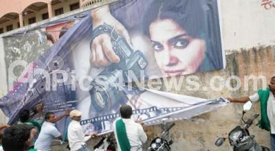 Photo Caption : Protesting farmers barged into padma theatre and stopped the screening and pulled down down the tamil movie poster in protest against release of Cauvery Water, in Mysuru on Tuesday 30th August 2016