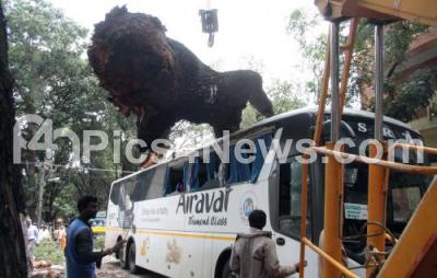 Photo Caption : Huge tree uprooted on the Airavata KSRTC bus at Malleswaram, no casualties were reported, in Bengaluru on Saturday 3rd September 2016