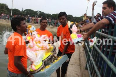 Photo Caption : Devotees partake in Gowri Ganesha idols immersion at Ulsoor Lake, in Bengaluru on Tuesday 6th September 2016