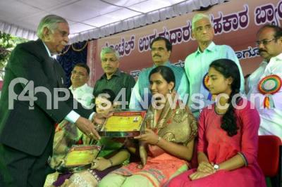 Former Chief Justice of Supreme Court MN Venkatachalaiah, Former Minister Jayaprakash Hegde, President Kannada Sahithya Parishath Manu Baligar, President Aklila Karnataka Bramhana Mahasabha KN Venkatanarayan, Managing Director Mayas Beverage and Foods PVT LTD Dr P Sadananda Maiya and others presenting 2015 and 2016 Talent Awards at Maratha Hostel Ground, organised by Hotel Udhyamadaara Sahakara Bank Limited, in Bengaluru on Sunday 11th September 2016