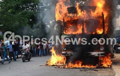 Photo Caption : Kannada activists burnt Tamil Nadu truck at Hosa Guddada Halli, during their protest against Tamil Nadu Govt and Supreme Court verdict on Cauvery river water, protesters burnt more than 15 Tamil Nadu vehicles, in Bengaluru on Monday 12th September 2016