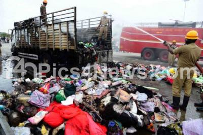 Photo Caption : Kannada activists burnt Tamil Nadu truck at PES College , Nice Road, , during their protest against Tamil Nadu Govt and Supreme Court verdict on Cauvery river water, protesters burnt more than 15 Tamil Nadu vehicles, in Bengaluru on Monday 12th September 2016