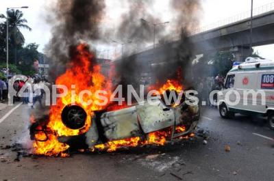 Photo Caption : Protesters burnt Tamil Nadu lorry at BHEL Circle due to Kannada activists protest against attack on Kannadigas in Chennai and Tamil Nadu Govt on Cauvery river water issue, in Bengaluru on Monday 12th September 2016