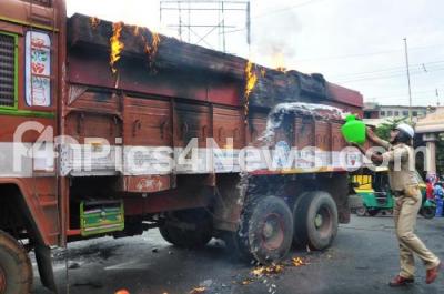 Protesters burnt Tamil Nadu lorry at BHEL Circle due to Kannada activists protest against attack on Kannadigas in Chennai and Tamil Nadu Govt on Cauvery river water issue, in Bengaluru on Monday 12th September 2016