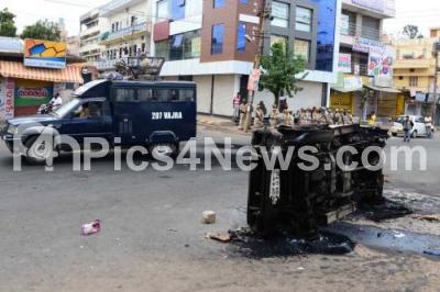 Photo Caption : Remains of Police Hoysala vehicle, which was burnt by protesters at Hegganhalli, Sunkada Katte, during Section 144 imposed after violence broke in many parts of Bengaluru city on Cauvery river water issue, in Bengaluru on Tuesday 13th September 2016