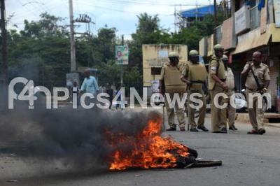 Photo Caption : Protesters burnt tyres to block the road at Hegganhalli, Sunkada Katte, during Section 144 imposed after violence broke in many parts of Bengaluru city on Cauvery river water issue, in Bengaluru on Tuesday 13th September 2016