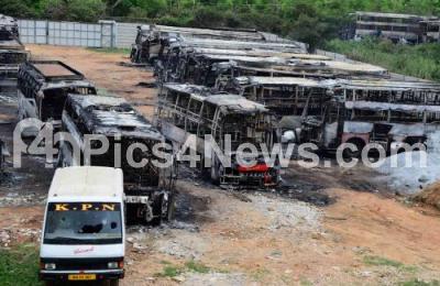 Photo Caption : Charred remains of 20 buses which were burnt by protesters yesterday at DSouza Nagar, Nice Road, during Section 144 imposed after violence broke in many parts of Bengaluru city on Cauvery river water issue, in Bengaluru on Tuesday 13th September 2016