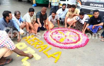 Photo Caption : Kerala Bus drivers celebrating pukkalam on the eve of Onam at Satellite Bus Stand Mysuru Road, during Section 144 imposed after violence broke in many parts of Bengaluru city on Cauvery river water issue, in Bengaluru on Tuesday 13th September 2016