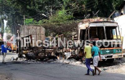 Photo Caption : Remains of Tamil Nadu registered vehicles which were burnt by protesters at Hosa Guddadahalli, during Section 144 imposed after violence broke in many parts of Bengaluru city on Cauvery river water issue, in Bengaluru on Tuesday 13th September 2016