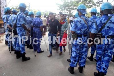 Photo Caption : RAF and Police personnel deployed at Bengaluru City Railway Station following Rail Roko called by Pro Kannada activist on Cauvery water dispute, in Bengaluru on Thursday 15th September 2016