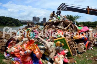 Event Description : Remains of Ganesha idols being removed from a pond at Hebbal, in Bengaluru on Thursday 15th September 2016