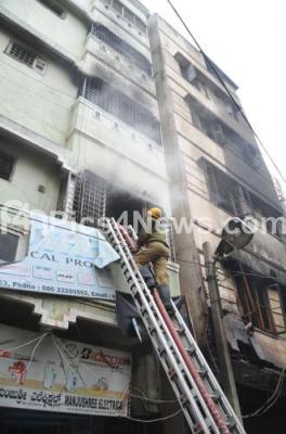 Firemen were pressed into action to douse off the fire at a building at BVK. Iyengar Road in Chikpete, an electrical shop on the third floor of a four storeyed building caught fire in the early hours,, in Bengaluru on Friday 16th September 2016