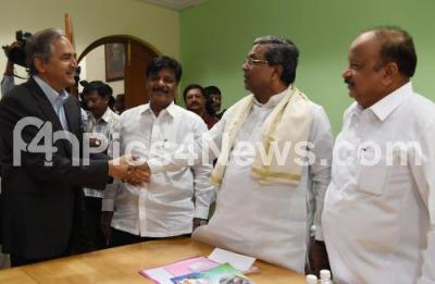Photo Caption : Dr Devi Shetty,Founder Chairman of Narayana Hrudayalaya met Chief Minister Siddaramaiah at Home office Krishna, in the presence of Ministers Roshan Baig and HC Mahadevappa, in Bengaluru on Friday 16th September 2016