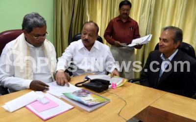 Photo Caption : Dr Devi Shetty,Founder Chairman of Narayana Hrudayalaya met Chief Minister Siddaramaiah at Home office Krishna, in the presence of Ministers Roshan Baig and HC Mahadevappa, in Bengaluru on Friday 16th September 2016