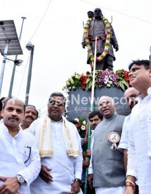 Photo Caption : CM Siddaramaiah with Mallikarjuna Kharge and others tribute to Sardar Vallabhai Patel statue and inaugurated various development projects during his visit to Kalaburagi on Saturday 17th September 2016
