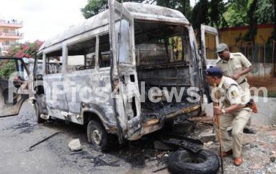 Photo Caption : Police inspecting the burnt tempo traveler at Nayandahalli police limits, during a flag march, to avoid untoward incidents, in Bengaluru on Tuesday 20th September 2016