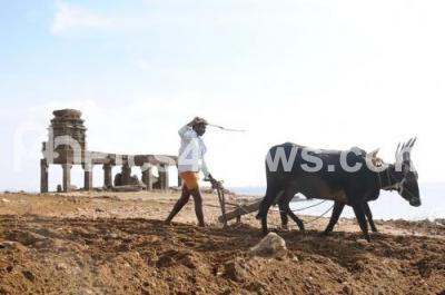 A farmer seen ploughing a field next to KRS Dam as Water levels have come down drastically at KRS dam ahead of the Supreme Court taking up the Cauvery water dispute case, in Mysuru on Tuesday 20th September 2016