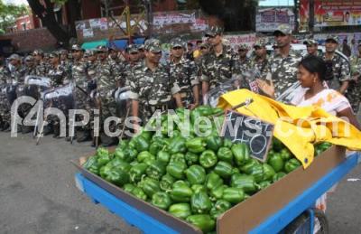 Photo Caption : A daily wage vendor seen passing by the RAF and police security at SBM Circle, in Bengaluru on Thursday 22nd September 2016