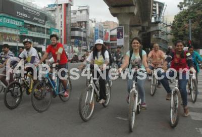 Event Description : Cyclists enjoy riding cycles on MG Road, during the History and Heritage Bicycle Ride to mark the World Tourism Day, organised by the state Department of Tourism, in Bengaluru on Tuesday 27th September 2016