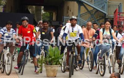 Cyclists enjoy riding cycles on MG Road, during the History and Heritage Bicycle Ride to mark the World Tourism Day, organised by the state Department of Tourism, in Bengaluru on Tuesday 27th September 2016
