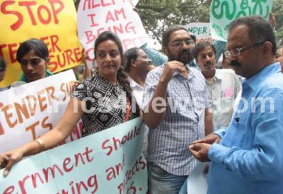 Event Description : Members of various organizations staged a protest against the cutting of trees at Nrupathunga Road for Tendersure project, in Bengaluru on Tuesday 27th September 2016