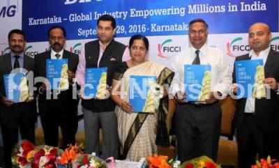Photo Caption : Justice Indrakala with Dinesh, President FICCI, Sushil Patra, KPMG and others seen releasing the state report “Direct Selling Karnataka†during the FICCI KPMG conference at Shangri La hotel, in Bengaluru on Thursday 29th September 2016