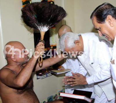 Event Description : Governor of Karnataka Vajubhai Vala being blessed by Swami Prasan Sagarji MahaRaj at Mahaveer Dharmashala, VV Puram b, in Bengaluru on Friday 30th September 2016
