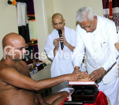 Event Description : Governor of Karnataka Vajubhai Vala being blessed by Swami Prasan Sagarji MahaRaj at Mahaveer Dharmashala, VV Puram b, in Bengaluru on Friday 30th September 2016