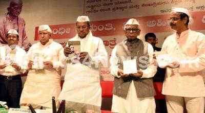 Photo Caption : CM Siddaramaiah with Minister HK Patil , Dr Ho Srinivasaiah, Vidhu Kumar and others releasing books on Mahatma Gandhi during Gandhi Jayanti celebrations at Gandhi Bhavan, in Bengaluru on Sunday 2nd October 2016