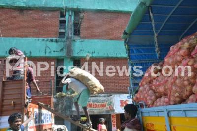 Event Description : Workers seen loading vegetables in a Tamil Nadu registered truck at kalasipalyam vegetable market, as the Trucks and bus services resumed between Karnataka and Tamil Nadu, which were severely disrupted and stopped for nearlya month due to Cauvery river water row, in Bengaluru on Wednesday 5th October 2016
