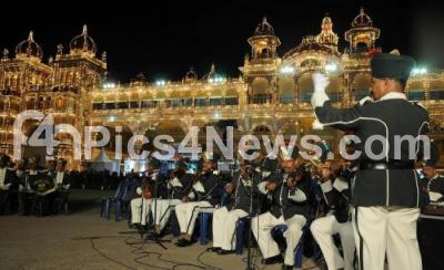 Photo Caption : Mysuru police band enthrall the crowd at the illuminated Mysuru Palace as part of Dasara 2016 celebrations in Mysuru on Thursday 6th October 2016