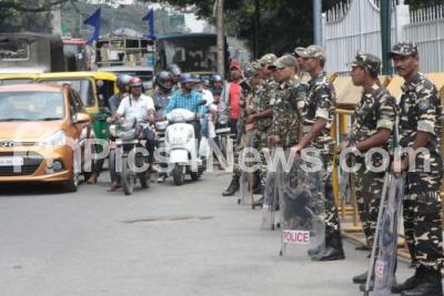 Photo Caption : Sashastra Seema Bal personnel tight vigilance in front of Town Hall, as protests are not being allowed due to section 144, for the Cauvery issue, in Bengaluru on Friday 7th October 2016