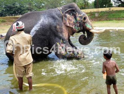 Photo Caption : Mahouts and Kavadis were busy today washing the elephants which seemed to enjoy the refreshing bath after the hectic schedule of Dasara Festivities in Mysuru City on Wednesday 12th October 2016