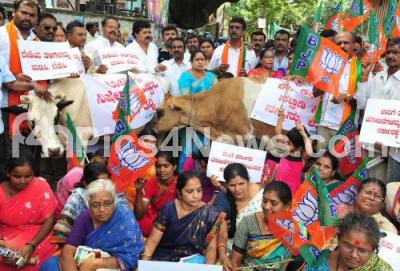 Event Description : Members of State BJP Milk Federation Forum staged a protest in demand for releasing the balance subsidies for Milk farmers, the protest was held at SBM Circle, in Bengaluru on Friday 14th October 2016
