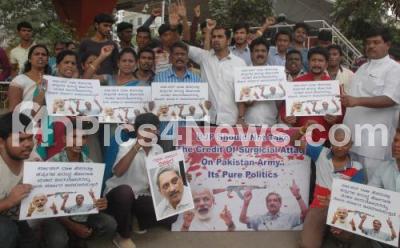 Photo Caption : Members and activists of Rajainagar Assembly Constituency Congress Committee IT Cell holding protest demonstration against the BJP for politicizing the Indian Army Surgical Strikes for its political benefits, the protest was held near Gandhi statue, anada rao circle , in Bengaluru on Friday 14th October 2016