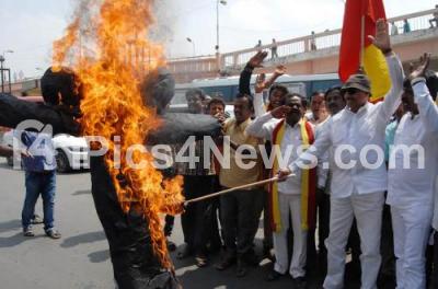Event Description : Vatal Nagaraj with his supporters burnt an effigy of Goa Chief Minister for his comments on Mahadayi River Project at Majestic Bus Stand, in Bengaluru on Friday 21st October 2016