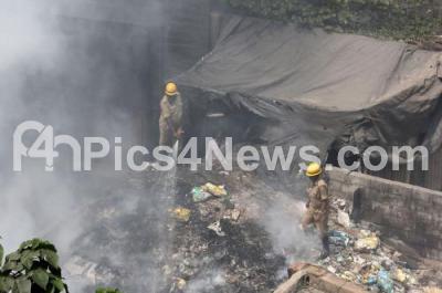 Photo Caption : Fire personnel douse the fire, where fire broke out at garbage dumping place at KR Market, in Bengaluru on Friday 21st October 2016