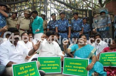 Photo Caption : MLA Goapalaiah with people who had lost their land in BDA projects and were still awaiting compensation seen holding a day long sitting dharna demanding immediate disbursement of compensation to land losers, following, one person by name Mangala yesterday attempted suicide by consuming poison, agitated land losers vociferously protesting before the BDA Head Office, in Bengaluru on Tuesday 25th October 2016