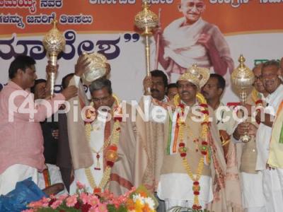 Photo Caption : CM Siddaramaiah with Dr G Parameshwar and Digvijay Singh were felicitated during the Surajya Samavesha, organised by KPCC at Palace Grounds, in Bengaluru on Thursday 27th October 2016