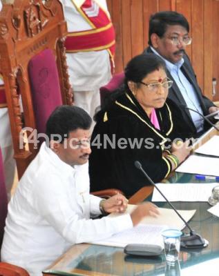 Photo Caption : Mayor Padmavathi with Deputy Mayor Anand and BBMP Commissioner N Manjunath Prasad during BBMP Council Session at BBMP, in Bengaluru on Friday 28th October 2016