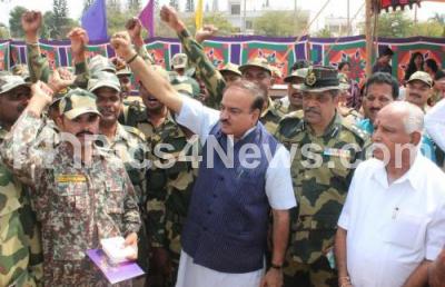Event Description : Union Ministers Ananthkumar, Sadananda Gowda and BJP State President and MP BS Yeddyurappa celebrating Diwali festival with Soldiers at BSF center, in Bengaluru on Sunday 30th October 2016