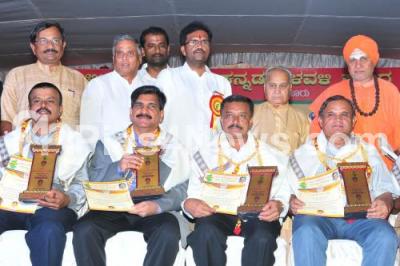 Photo Caption : MLC V Somanna presenting "Parameshwara Pulikeshi†awards during Kannada Rajyotsava celebrations organized by Kannada Chaluvali Kendra Samiti also seen are Prof Shivanubhava Charamamurthy, Dr Nallur Prasad, Gurudev Narayan and others at Bannappa Park, in Bengaluru on Wednesday 2nd November 2016