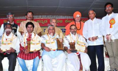 Photo Caption : MLC V Somanna presenting "Parameshwara Pulikeshi†awards during Kannada Rajyotsava celebrations organized by Kannada Chaluvali Kendra Samiti also seen are Prof Shivanubhava Charamamurthy, Dr Nallur Prasad, Gurudev Narayan and others at Bannappa Park, in Bengaluru on Wednesday 2nd November 2016