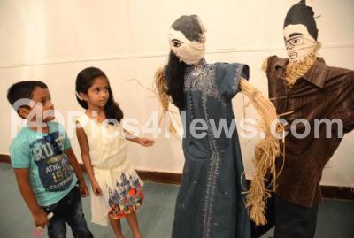 Photo Caption : Children looking at arts works exhibition of "Secrets from Scarecrow" at Venkatappa Art Gallery, in Bengaluru on Thursday 3rd November 2016