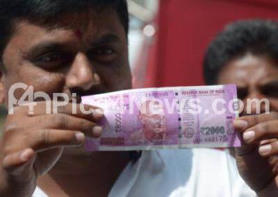 Photo Caption : A man seen displaying the new Rs 2000 currency note in exchange of the old Rs 500 and Rs 1,000 notes at a bank, as they were banned in a surprise announcement by Prime Minister Narendra Modi to check black or untaxed money, in Bengaluru on Thursday 10th November 2016