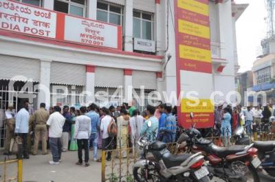 Photo Caption : Long queues formed at Post office in Mysuru, as people rushed to deposit and swap Rs 500 and Rs 1,000 notes, banned in a surprise announcement by Prime Minister Narendra Modi to check black or untaxed money, in Mysuru on Friday 11th November 2016