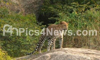 Photo Caption : A 4 year old leopard was spotted on a huge boulder adjoining the Gavi Mutt at the foot of Chamundi Hill near Gowrishankar near Mysuru City, has caused scare among the residents of the area, on Sunday 13th November 2016