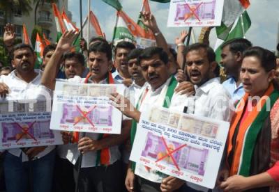 Youth Congress members led by Rizwan Arshad protested against the demonetisation of Rs 500 and Rs 1000 currency notes at Gandhi Statue, Anand Rao Circle, in Bengaluru on Monday 14th November 2016